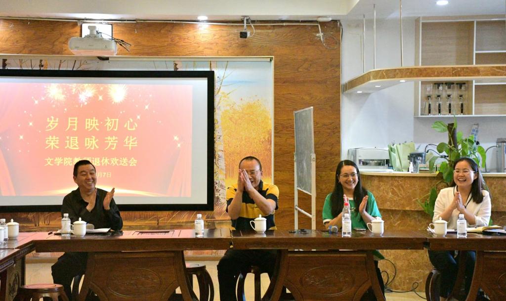 罗萍老师表示文学院是个非常温暖的大家庭,工作二十年让她找到了归属感,同时结交了许多朋友,感谢领导同事一路的帮助支持,最后希望文学院越来越好。周鲁老师表示,深切感受到文学院的人文情怀,内心十分感动,感叹时光易逝,希望各位同事珍惜每一天的生活。