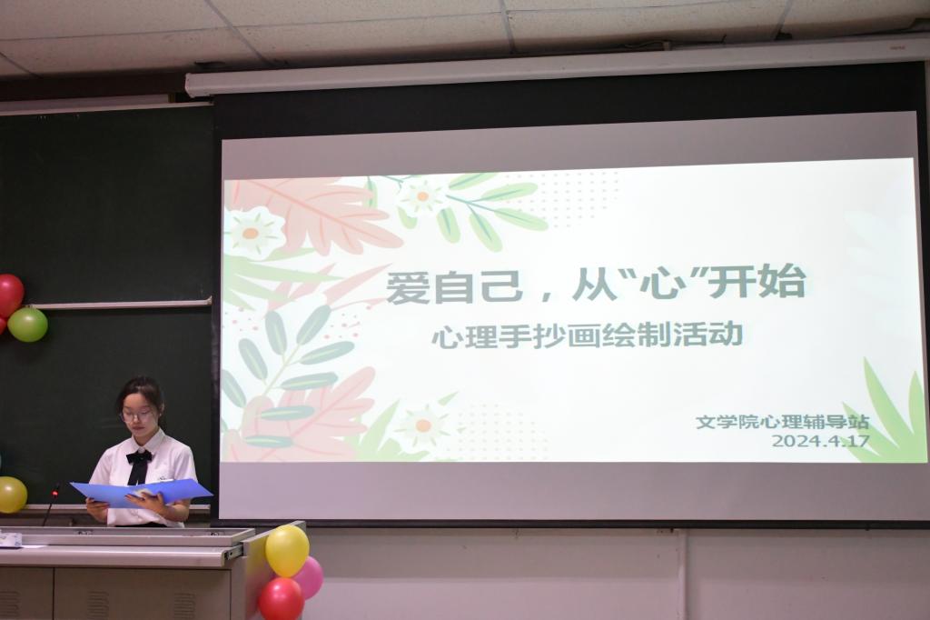 为引导学生关注心理健康,增强心理健康意识,树立正确的心理健康观念,文学院于4月17日晚上19点40在1-108开展以“爱自己,从‘心’开始”为主题的心理手抄画绘制活动。此次活动由魏娇主持,文学院党总支副书记汪大喹、文学院分团委书记张杰、文学院心理辅导站站长周莹、2022级辅导员周立丙、2023级辅导员冷虹出席,文学院部分学生参与。