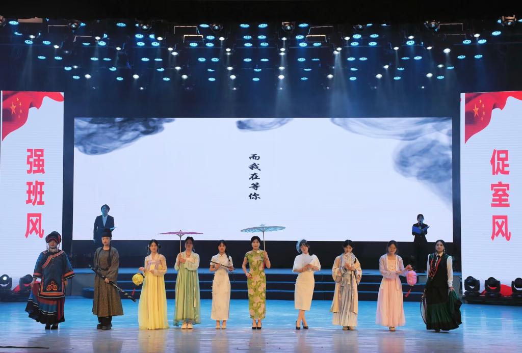 大赛上,2023级汉语言文学本科2班介绍班级建设成果、展示班级荣誉、彰显班级风采。伴着悠扬的古筝声,同学们为我们带来茶艺表演,展现了我院学子对优秀传统文化的继承与热爱;踩着《青花瓷》的鼓点,同学们身着少数民族服饰、旗袍、汉服优雅走来,为我们带来一场视觉盛宴;《红旗颂》以舞蹈的形式表达对祖国的热爱,矫健的舞姿尽显同学们的青春活力,背后的国旗与院旗随风高扬;大合唱《歌唱祖国》充分展现出大家对祖国的祝福歌颂和美好愿景。他们以茶会友,以舞结情,以歌表爱,传统文化和流行文化相融,让班级风采的展示更加丰富多面,荣获优秀奖。