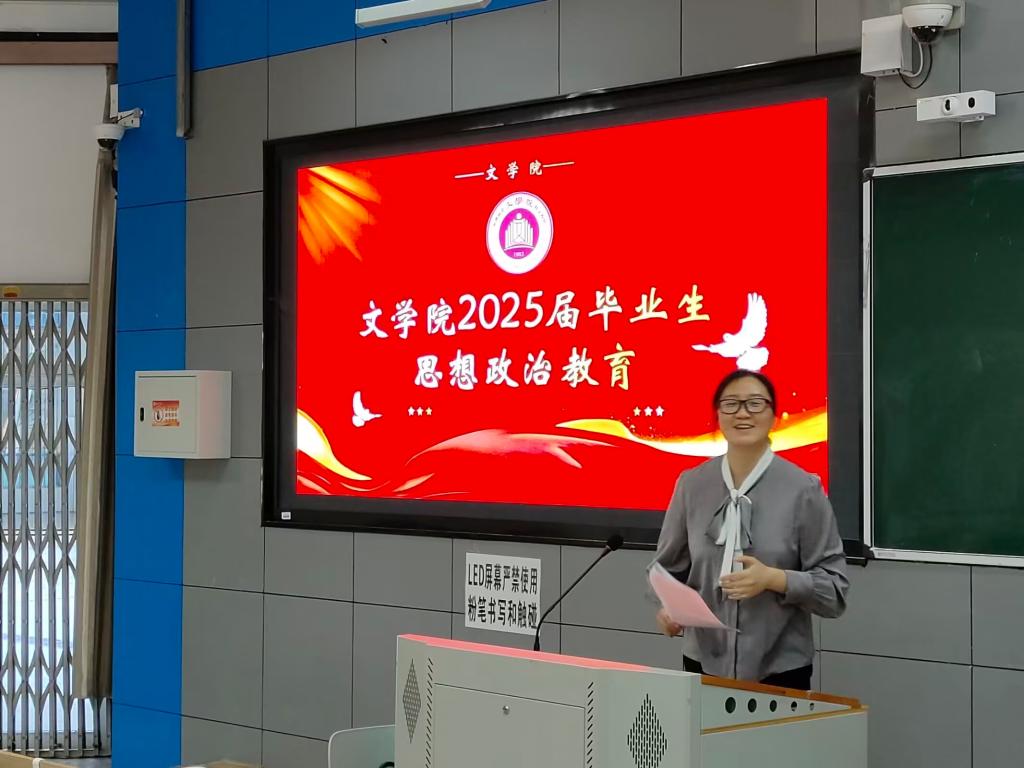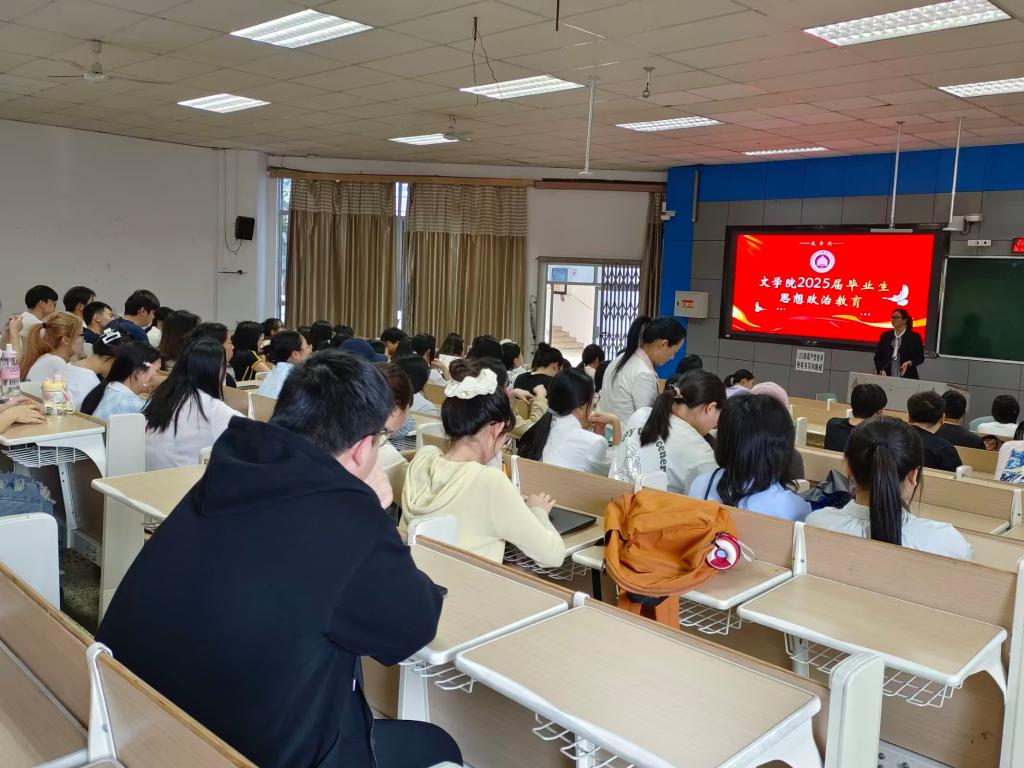 为引导毕业生树立正确三观,提升思想政治素养,文学院于近期在1-116教室开展2025届毕业生思想政治教育活动。此次活动由文学院党总支副书记王春梅主持,学生科负责人周莹、21级毕业生参与活动。