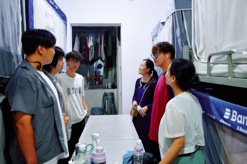 走访期间,老师们对刚刚结束军训的同学们表示亲切慰问,充分肯定大家在军训中展现出的坚韧意志和团结精神,并温馨提醒大家合理安排休息、及时调整作息。随后,他们细致询问新生对宿舍生活的适应情况,认真检查寝室环境卫生与设施运行状况,耐心解答同学们提出的各类问题。围绕宿舍安全,老师们重点强调了用电规范,并叮嘱同学们国庆期间要注意安全,按照规定时间归寝。