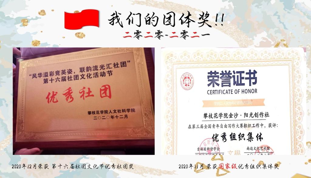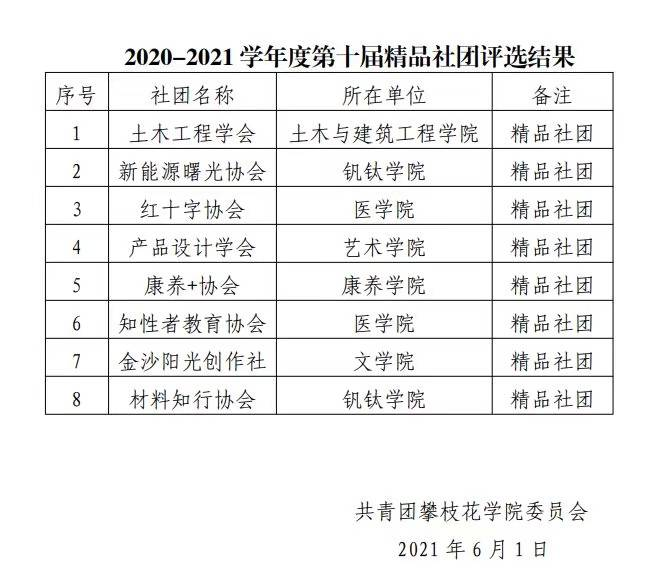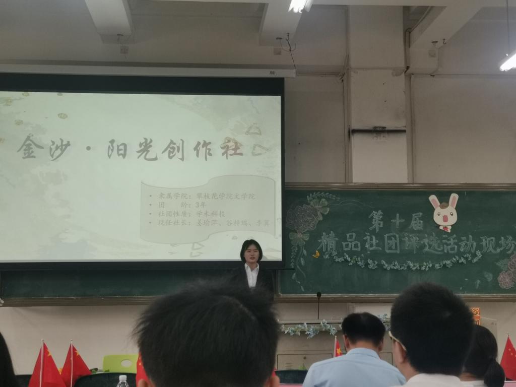 2021年5月30日上午,攀枝花学院第十届精品社团评选活动在二教2-3举行。文学院金沙·阳光创作社在此次评选中荣获精品社团的称号,成为连续两届获此殊荣的一星级社团。