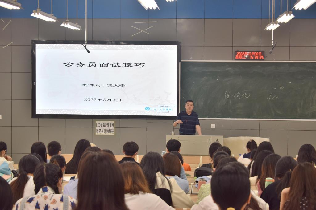 为提升毕业生公务员考试面试技巧,帮助毕业生顺利通过考试。3月30日下午,文学院于二教2-1召开公务员面试技能技巧培训会。本次会议由文学院党总支副书记汪大喹(主持工作)、党总支副书记王春梅主讲,2018级毕业生参加。